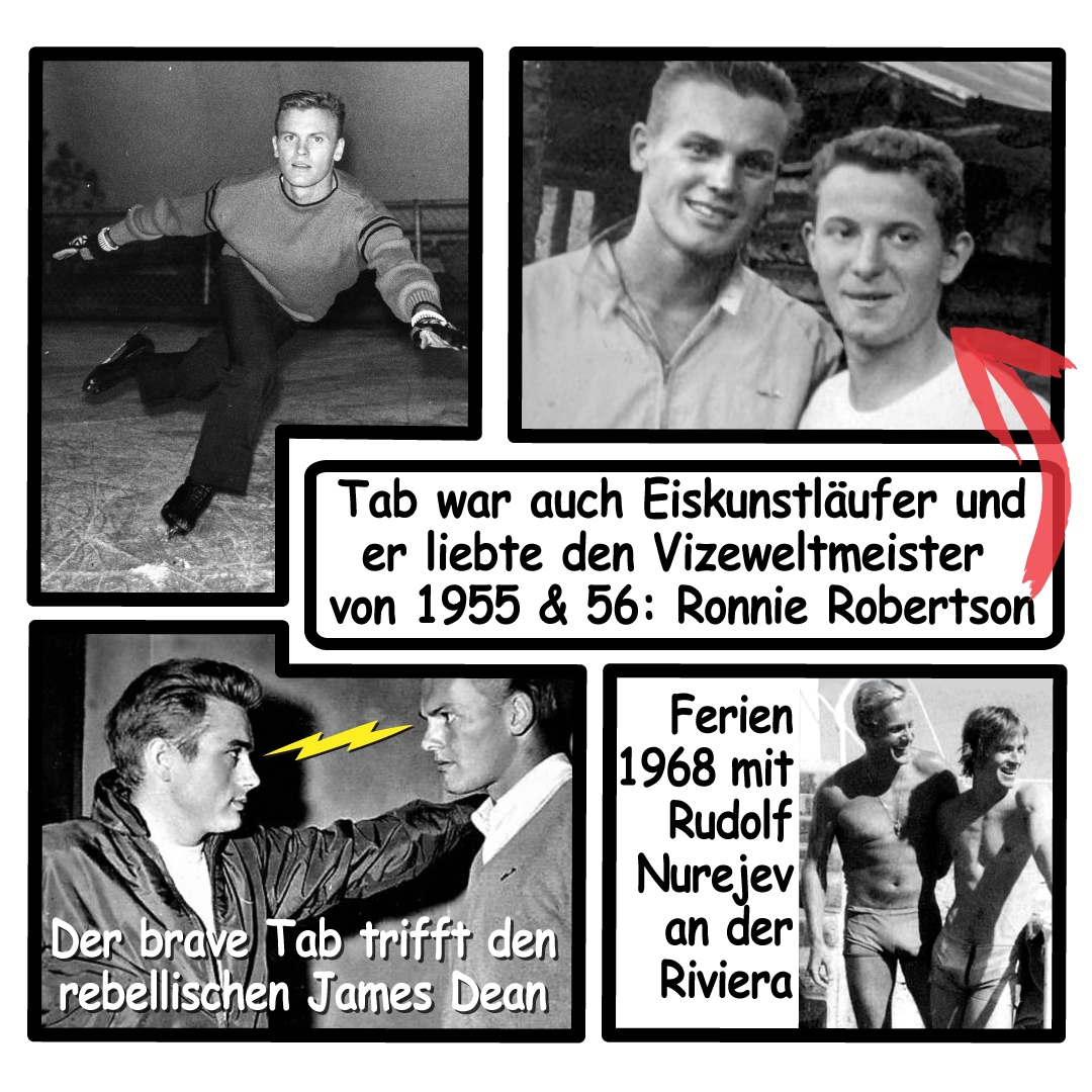 Noch vor Tabs Filmdebüt, wurde er bei einer Razzia an einer privaten Gay-Party festgenommen. Sein Agent und der Studioboss konnten den Skandal zwar unter dem Deckel halten, doch Jahre später, als seine Karriere an Fahrt aufnahm, berichtet die Presse dann doch darüber. Die Zeitschrift Confidential drohte 1955 Rock Hundson zu outen, der grad auf dem Höhepunkt seiner Karriere war. Um das zu verhindern ging das Studio einen Deal mit Confidential ein: Ihr könnt über die Verhaftung von Tab Hunter berichten, aber dafür schweigt ihr über Rocks Homosexualität. Der Skandal schien Tab Hunter vorerst nicht gross zu schaden. Vermutlich weil es die Öffentlichkeit für zu absurd hielt, dass dieser sympathische All-American-Boy schwul sein soll. Tab Hunter aber war verstört. Er wusste, dass er schwul ist, überlegte sich trotzdem, eins der Starletts zu heiraten, mit dem ihn das Studio verkuppelte, um das Image als Frauenheld aufrechtzuerhalten. Tab Hunter schrieb in seiner Biografie, dass er das einer Frau — und auch sich selber — nicht antun wollte. Er zeigte sich an Filmpremieren weiterhin mit Frauen, traf aber heimlich Männer. So hatte er eine Beziehung mit dem Eiskunstläufe Ronnie Robertson und mit seinem Schauspielkollege Anthony Perkins. Tony, wie Perkins von Freunden genannt wurde, wurde 1960 mit dem Hitchcock-Film «Psycho» zum Star. Tab und Tony hatten eine stürmische Affäre die fast zwei Jahre dauerte. Doch das Verstecken, die heimlichen Treffen, waren einfach zu anstrengend. Tony heiratet 1970 dann eine Frau und gründete eine Familie. Tab Hunter fand sein Liebesglück erst viel später