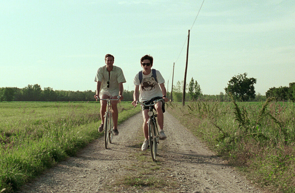 Als weiteren Unsicherheitsfaktor in Elios Gefühlswelt führt der Film schon zu Beginn den 24-jährigen Doktoranden Oliver ein, belässt dessen Haltung gegenüber Elio aber zunächst in der Schwebe. Oliver ist gebildet und stammt ebenfalls aus einer jüdischen Familie, unterscheidet sich durch eine sportliche Gestalt und sein selbstsicheres Auftreten aber markant von dem noch jugendlich unbeholfenen Elio. Der Sommergast könnte wie ein Kamerad oder grosser Bruder für ihn sein, entzieht sich aber zunächst. Gleichwohl kommt es zu ersten gemeinsamen Unternehmungen und einer wachsenden Freundschaft, die Elio schliesslich veranlasst, bei einem Fahrradausflug das Gefühl völliger Unerfahrenheit zu gestehen. Auf dem Heimweg führt er Oliver zu seinem geheimen Rückzugsort, noch weit abgeschiedener als die elterliche Villa, wo sich die bis dahin diffusen Schwingungen zwischen ihnen in einem Kuss konkretisieren. Eine Gefühlsäusserung, die zunächst die Distanz der beiden vergrössert, bis Elio es nicht mehr aushält. Eine nächtliche Verabredung mit Oliver lässt ihn begreifen, dass er in ihm die erste Liebe gefunden hat – und dass dieser ihm insgeheim längst signalisiert hat, dass er das gleiche empfindet.