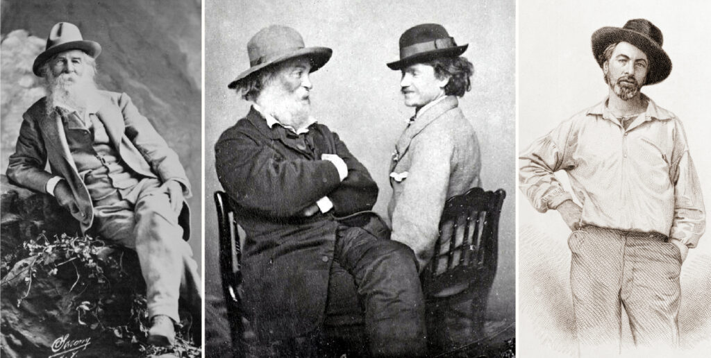 Walt Whitman 1879, mit Peter Doyle, circa 1869 und ein Stahlstich für das Buch «Leaves of Grass», 1855