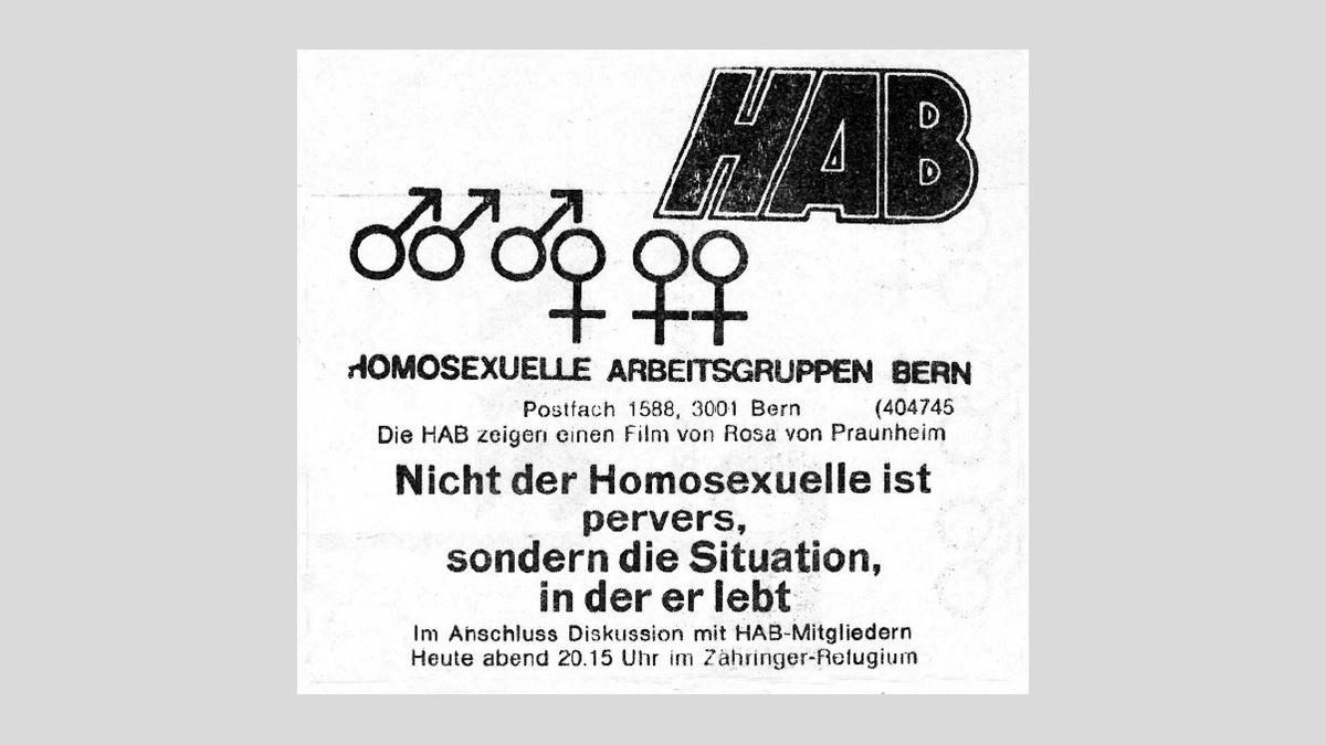 Das Zähringer-Refugium, ein Kleintheater an der Badgasse in Bern (heute Restaurant zum Zähringer), war am Abend des 13. Februar 1975 mit 150 Personen randvoll. Gezeigt wurde der Film «Nicht der Homosexuelle ist pervers, sondern die Situation, in der lebt» mit anschliessender Fragerunde.